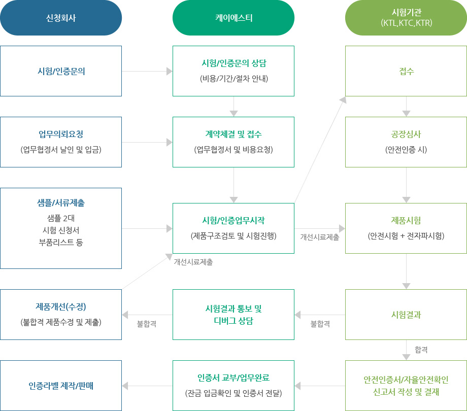 안전인증대상 전기용품에 대하여 안전기준에 따라 적합성을 확인하는 제품시험과, 제조자가 인증대상 전기용품의 품질을 지속적으로 유지할 수 있는지 여부를 확인하는 공장심사를 통해 시장유통 전에 전기용품에 대한 안전성을 검증하는 절차입니다.
